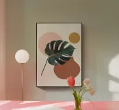 monstera leaf geometric shapes pink circle ochre circle botanical nature organic shapes plant foliage minimal design vase shape tropical theme natural elements leaf indoor plant cutout shapes negative space modern design tropical leaf decorative elements