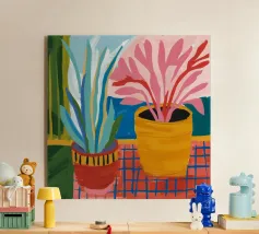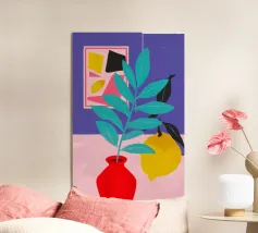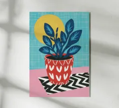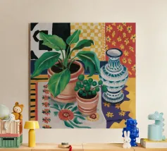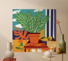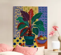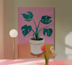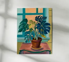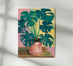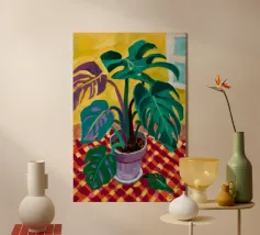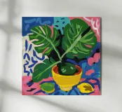 Una vivace natura morta di una pianta di monstera in un vaso giallo, su uno sfondo di motivi astratti e colorati. La composizione è un mix vivace e giocoso di forme naturali e design moderno.