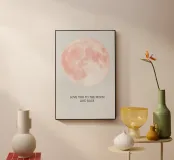 "Moon 01" raffigura una delicata luna piena color rosa con l'affettuosa scritta Love you to the moon and back. Il design minimalista porta calma, calore e un tocco di magia in ogni casa. Ideale per camere da letto, camerette di neonati e bambini o come regalo affettuoso per persone speciali. La combinazione di colori tenui è moderna e senza tempo, perfetta per chi cerca un accento poetico ed emozionale nella propria parete.