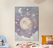 A gentle moon with rosy cheeks drifts peacefully above a sky full of sleepy stars and soft lavender clouds. This poetic artwork captures the dreamy calm of a child's imagination at bedtime, where the moon smiles and the universe feels safe. Created in soft watercolor textures and delicate pastel hues, this piece is perfect for nursery walls, evoking serenity, joy, and wonder. Let this peaceful lunar scene guide little dreamers into magical sleep.