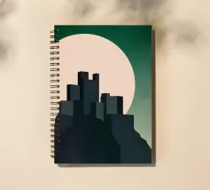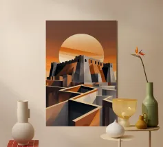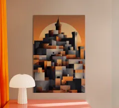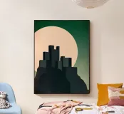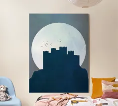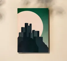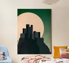 Questa illustrazione minimalista ritrae una cittadella torreggiante che si erge da scogliere scure sotto una luminosa luna piena. I toni verdi tenui e le sfumature morbide creano un'atmosfera calma e suggestiva, mentre le forme geometriche e le linee pulite evocano un senso di mistero e forza senza tempo. Ideale per interni moderni e d'ispirazione scandinava, quest'opera d'arte aggiunge un raffinato tocco di fantasia senza invadere lo spazio.