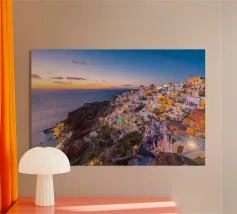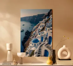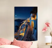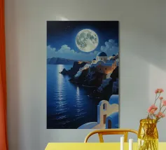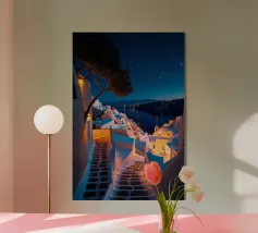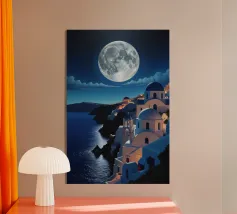 Scoprite il fascino dei sentieri al chiaro di luna di Santorini, che si snodano tra le iconiche strutture imbiancate dell'isola. La luce scintillante della luna piena bagna le scogliere e i sentieri, offrendo un bagliore ultraterreno. Le calde tonalità dorate delle finestre e delle porte illuminate contrastano con il blu profondo del Mar Egeo. Le stelle scintillano in alto, creando un'armonia celestiale con il paesaggio sereno sottostante. Questa scena incarna l'essenza della tranquillità mediterranea e della bellezza senza tempo.