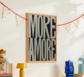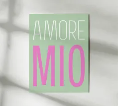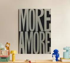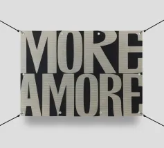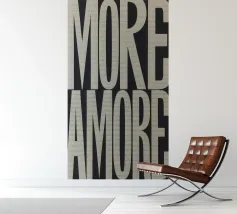 Design tipografico moderno con la scritta "MORE AMORE" in caratteri grandi e sans-serif su sfondo nero. Le lettere impilate verticalmente, di colore grigio chiaro e bianco sporco, con un aspetto strutturato e intrecciato, conferiscono al motivo profondità e un aspetto tattile.