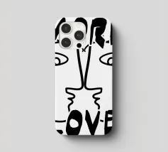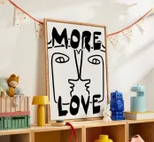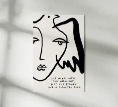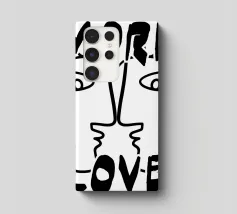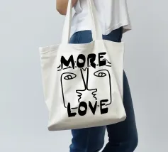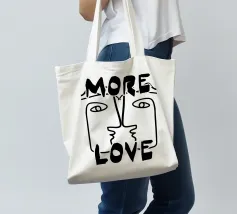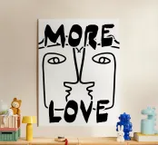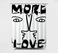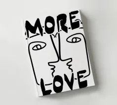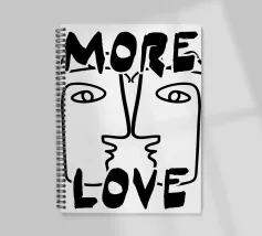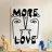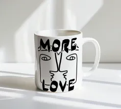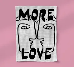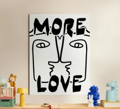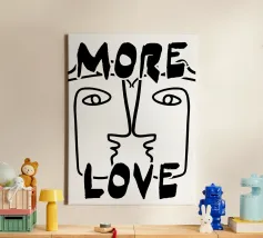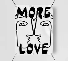 Linee nere decise formano una rappresentazione simmetrica e astratta di due volti, con la scritta "MORE LOVE" integrata nel design. Lo stile minimalista enfatizza il messaggio di affetto e connessione.