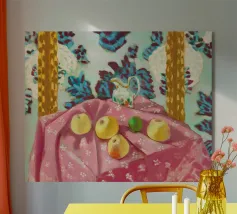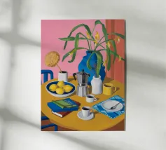 "Morning Table Setting" è una deliziosa natura morta che cattura la bellezza di un'accogliente scena di colazione. Con toni tenui e pastello e pennellate giocose, questo dipinto riunisce una tavola adornata con piatti colorati, tazze e un semplice vaso di fiori. La disposizione casuale di frutta e stoviglie crea un'atmosfera calda e invitante, evocando la quiete confortante di un pasto mattutino. Perfetto per aggiungere fascino e un tocco di semplicità quotidiana a qualsiasi spazio. Progettato da BALIKA HOMES.