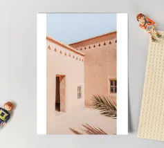 Atmosfera marocchina. Fotografia di strada in Marocco. Edificio in argilla e palma. Scena botanica di strada.