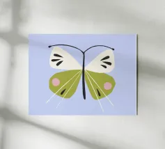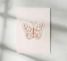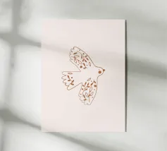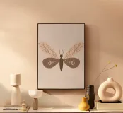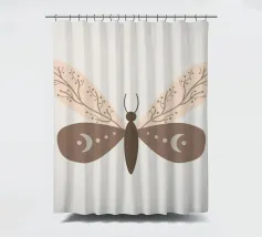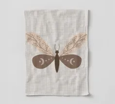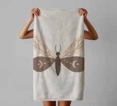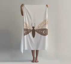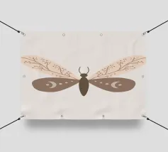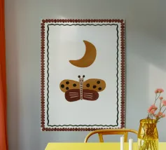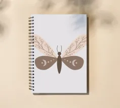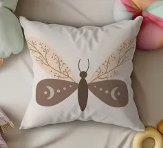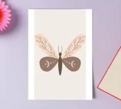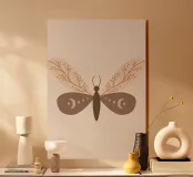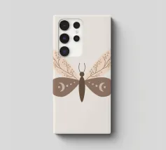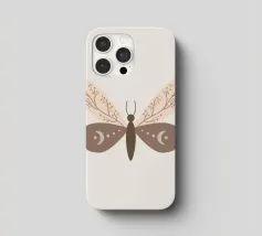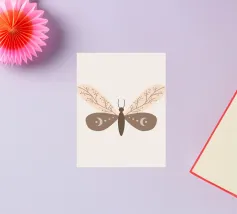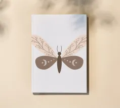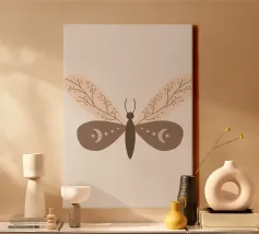 La rappresentazione stilizzata di una falena presenta intricati disegni sulle ali, che incorporano motivi naturali e celesti. Le ali presentano delicati contorni di rami e forme di luna crescente, su una tavolozza di colori tenui.