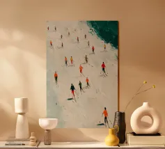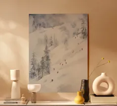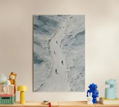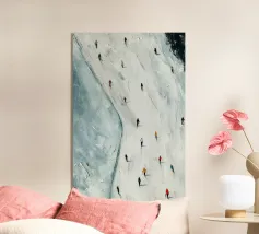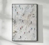 Una dinamica veduta aerea di una stazione sciistica invernale, dove gli sciatori si muovono tra i pendii innevati delle montagne. La scena energica contrasta con l'ambiente tranquillo circostante, evidenziando la vastità della località e il senso di avventura. Pennellate decise creano consistenza e movimento, immergendo lo spettatore nell'emozione degli sport invernali.