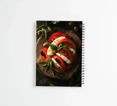 pomodori mozzarella basilico olive piatto di legno insalata caprese erbe fresche fette sfondo scuro olio d'oliva pepe aceto balsamico ingredienti semplici prodotti freschi cucina italiana presentazione gourmet antipasto stile rustico foglie verdi illuminazione naturale