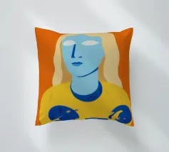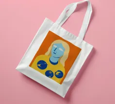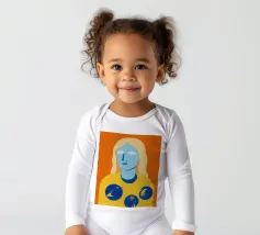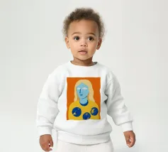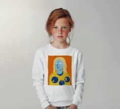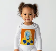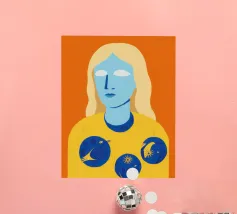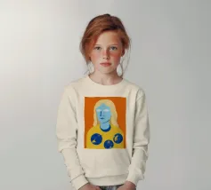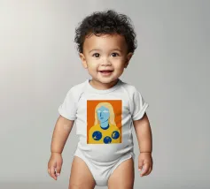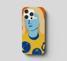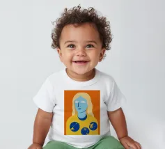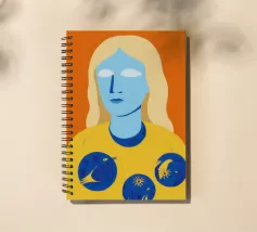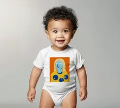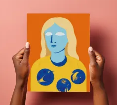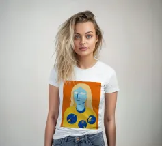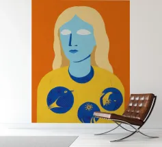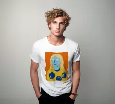 Un ritratto surreale e artistico di una figura dalla pelle blu e dai capelli biondi, che indossa una camicia gialla ornata di simboli celestiali come la luna e le stelle.