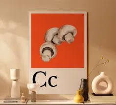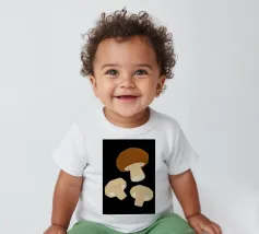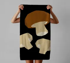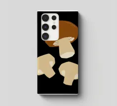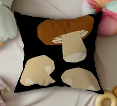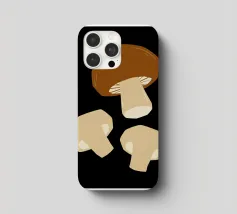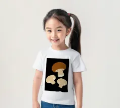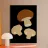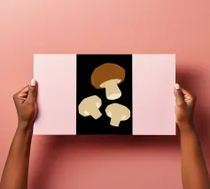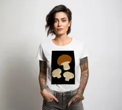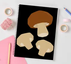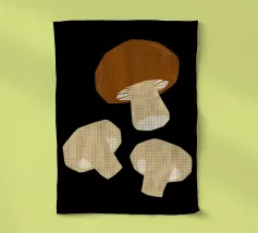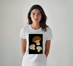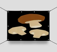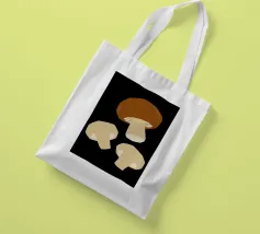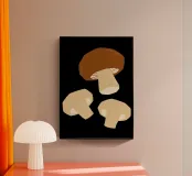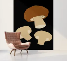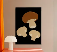 Tre funghi stilizzati si stagliano su uno sfondo nero, con uno che mostra la sua parte inferiore. L'uso di forme semplici e audaci e di colori piatti crea un design moderno e minimalista.