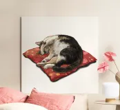 Un piccolo gatto assonnato accoccolato su un cuscino a stampa floreale rossa.