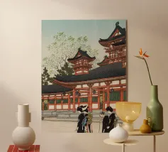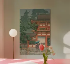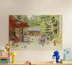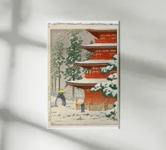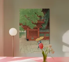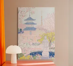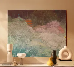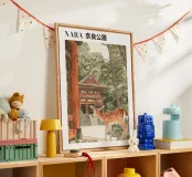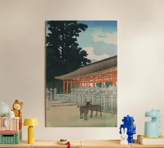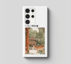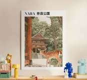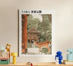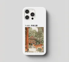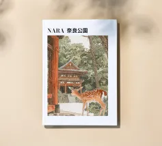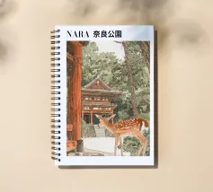 Il disegno "Nara" mostra un tranquillo paesaggio forestale con uno dei famosi cervi di Nara, in Giappone, ispirato ai classici ukiyo-e e rifinito con delicati elementi ad acquerello. Un motivo ideale per gli amanti del Giappone!