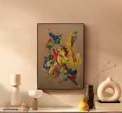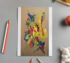 Quest'opera è realizzata su un foglio di cartone senza colorazione, lasciando visibili sullo sfondo le fibre di legno che la compongono. L'obiettivo è quello di presentare un'opera dipinta che mantenga un aspetto grezzo, offrendo un supporto che evochi la sua origine naturale. Il risultato è un'armonia e una maggiore facilità di integrazione in diversi stili di arredamento.