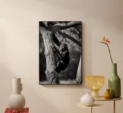 Immaginate una suggestiva scena in bianco e nero di una scimmia che si arrampica con grazia su un albero nodoso. La scimmia, con i suoi arti agili e il suo volto espressivo, è in pieno movimento, con una mano che afferra un ramo spesso mentre il suo corpo si protende verso il tronco. La corteccia strutturata contrasta nettamente con la morbidezza della pelliccia della scimmia. Le ombre giocano in modo drammatico sulla scena, esaltando i contorni dell'albero e la forma della scimmia. L'atmosfera sembra quasi eterea, evocando un senso di immobilità e concentrazione in mezzo alla natura selvaggia. I rami in alto creano un baldacchino, filtrando la luce e aggiungendo profondità alla composizione.