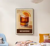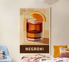 A modern geometric interpretation of the classic Negroni cocktail. Layered shapes, warm amber tones, and precise graphic lines create a structured yet inviting composition inspired by mid-century design and contemporary poster art. Bold, balanced, and visually refined, this artwork brings character, color, and a timeless aperitivo mood to modern interiors.