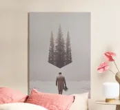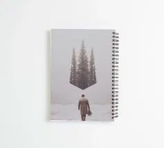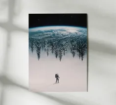 Un collage digitale surreale. Un uomo in cappotto cammina nella neve, tenendo in mano rami di pino tagliati. Sopra: una foresta capovolta, che si libra come una dimensione speculare. Un'immagine tranquilla sul ritiro interiore, la disconnessione e la distanza emotiva.