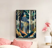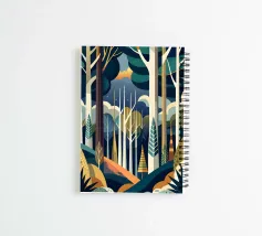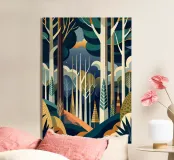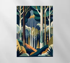 Un'illustrazione vibrante e onirica di una foresta mistica, con alberi imponenti, un sentiero tortuoso e un senso di serenità. Questo pezzo cattura la bellezza e il mistero della natura.