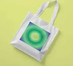 Abstract, luminous round shapes seem to float in a coloured void. The work evokes a cosmic journey in dense light.