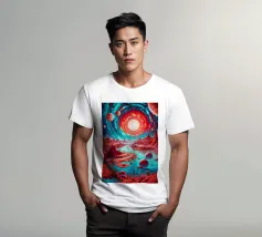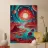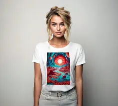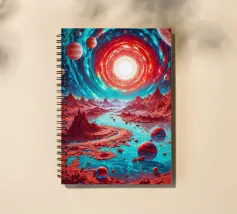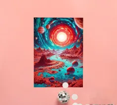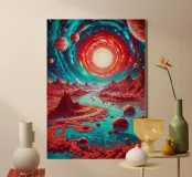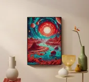 Surreale mondo alieno al neon - pianeti rossi adornano la tela cosmica sotto un sole colossale, un regno fantastico dove le montagne astratte incontrano le meraviglie dell'immaginazione interstellare.