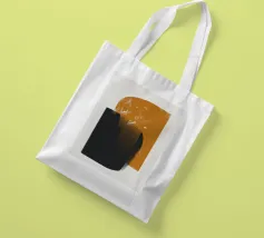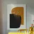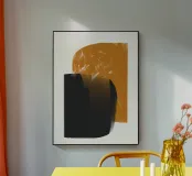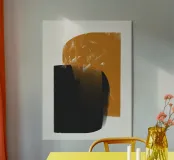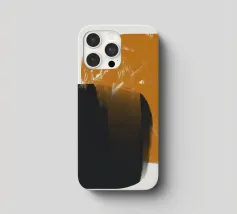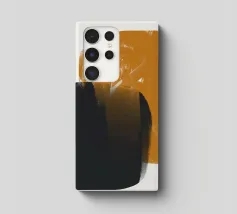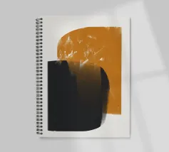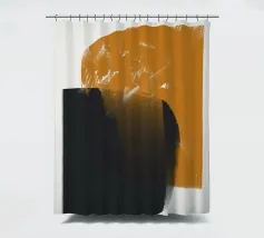 Forme geometriche astratte con forme audaci e sovrapposte in nero e arancione creano un equilibrio visivo dinamico. Il design minimalista offre un'estetica moderna, enfatizzando il contrasto e la semplicità.