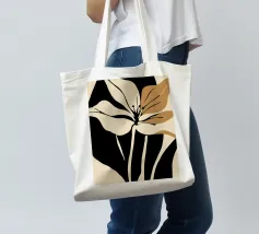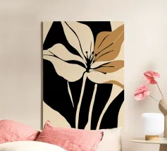 Un audace motivo floreale astratto è raffigurato nei colori nero, beige e marrone, che mostrano l'eleganza di un fiore stilizzato. Il gioco di colori e forme crea una composizione dinamica e armoniosa.
