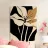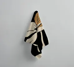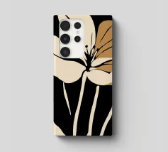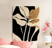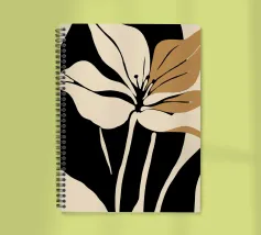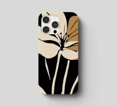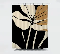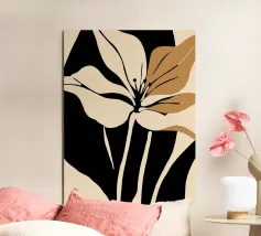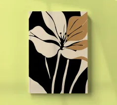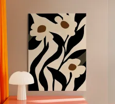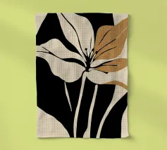 A bold, abstract floral pattern is depicted in black, beige, and brown, showcasing the elegance of a stylized flower. The interplay of colors and shapes creates a dynamic yet harmonious composition.