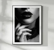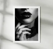 Poster in bianco e nero di un primo piano glamour con labbra laccate lucide e una mano elegante che indossa un anello incastonato. La luce dello studio crea una pelle liscia e satinata e un bokeh setoso per un'atmosfera lussuosa e alla moda. Una composizione chic e minimalista che sublima la femminilità e i gioielli. Perfetta per il salotto, il camerino, la boutique o il salone di bellezza. Un'idea regalo per gli amanti della fotografia e della moda.