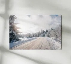 Le impronte dei pneumatici premono delicatamente sulla neve fresca e si allontanano sotto gli alberi spogli e smerigliati. L'aria è frizzante e immobile, con solo il lieve scricchiolio dei passi che rompe il silenzio. I fiocchi di neve scendono lentamente, aggiungendo un'atmosfera pacifica e quasi magica. La strada sembra calma e infinita, come un percorso nel sogno dell'inverno".