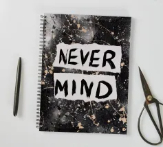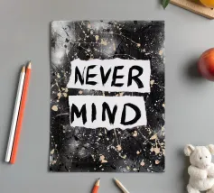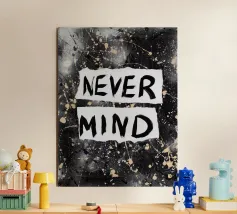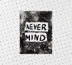 "Nevermind" è stato originariamente creato su tela con graffiti e acrilico e intende sostituire i noiosi slogan "Live, Laugh, Love".