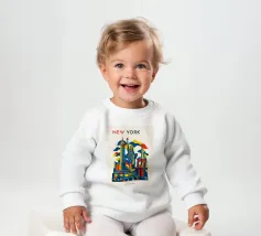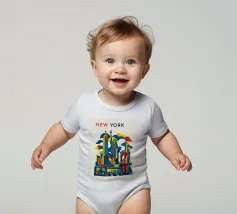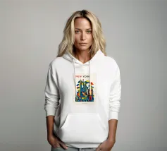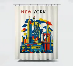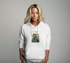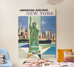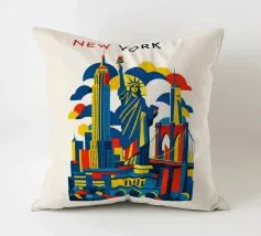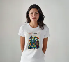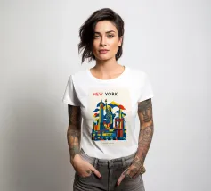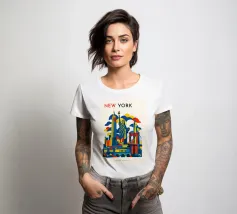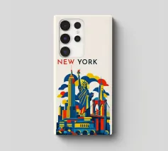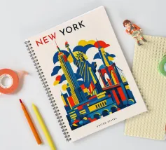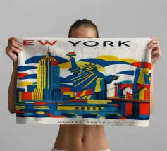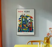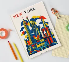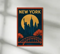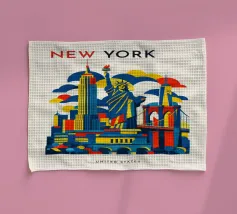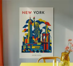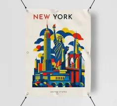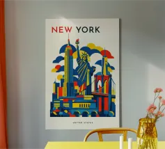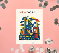 A bold, graphic celebration of New York City, captured through clean geometry and confident colour blocking. Iconic landmarks rise in layered harmony, with the skyline arranged to create depth, rhythm, and a strong sense of vertical energy. The composition feels dynamic and optimistic, reflecting the city’s scale and momentum without relying on fine detail.