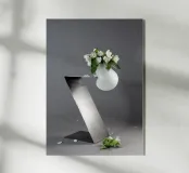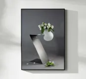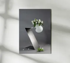 Stampa d'arte concettuale "Equilibrio precario"! Questa bellissima e avvincente fotografia cattura un vaso bianco liscio e rotondo che regge una vibrante felce verde, drammaticamente in equilibrio su un pesante blocco geometrico scuro inclinato. L'elevato contrasto e la tensione tra la natura organica e la geometria industriale creano una potente dichiarazione di equilibrio e fragilità. Arte da parete perfetta per spazi moderni, minimalisti e contemporanei. Ideale per un soggiorno, un ufficio o una casa in stile scandinavo. Equilibrio, Equilibrio, Arte concettuale, Felce, Pianta, Vaso rotondo, Geometrico, Scultura moderna, Minimalista, Con
