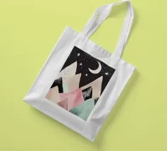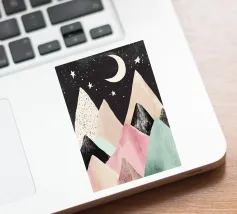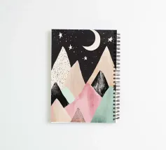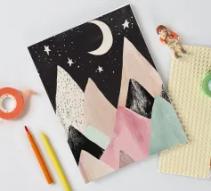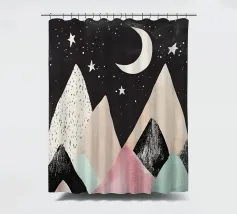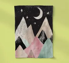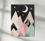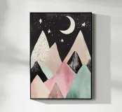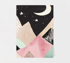 Una simpatica illustrazione di montagne dai colori pastello con stelle e luna, un design minimalista in stile vintage con forme semplici, una texture disegnata a mano e clipart su sfondo nero. L'immagine è ad alta risoluzione, di alta qualità e molto dettagliata.