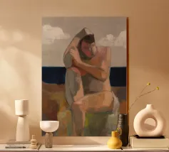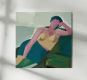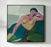 Un dipinto moderno in stile classico, che raffigura una persona che si riposa pensierosa. L'uso di luci e ombre sulla forma, unito alla posa rilassata, conferisce al dipinto una qualità artistica senza tempo.