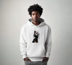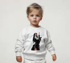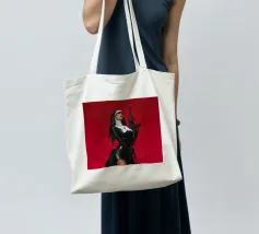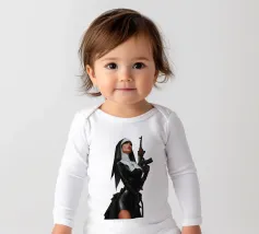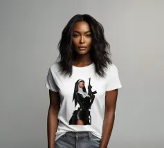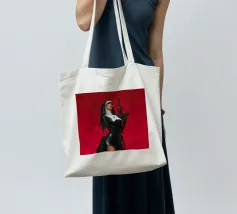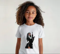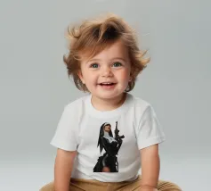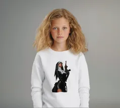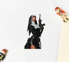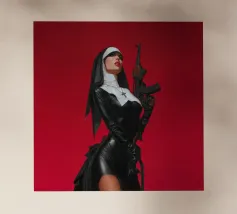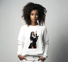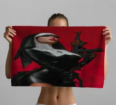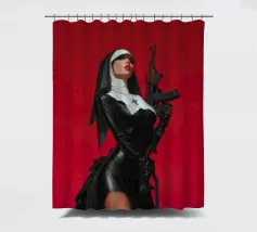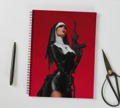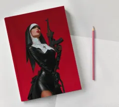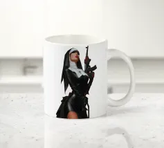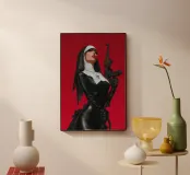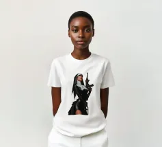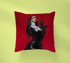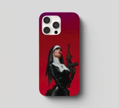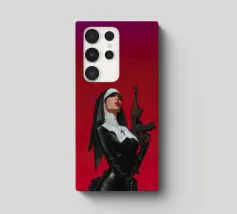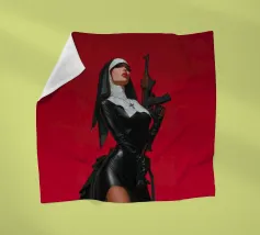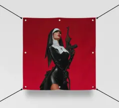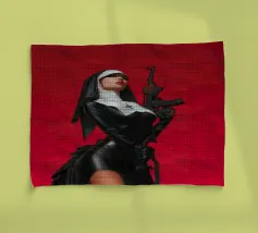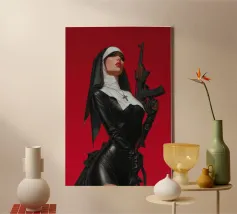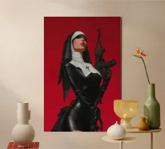 Un'immagine audace e di forte impatto che fonde simbolismo religioso e provocazione contemporanea. Su uno sfondo rosso intenso, una figura composta in abiti tradizionali devozionali è resa con realismo lucido e raffinatezza editoriale. Il contrasto tra l'espressione serena, gli abiti immacolati e l'elemento moderno e militaristico crea una potente tensione visiva che appare deliberata, iconica e inquietante in egual misura.