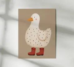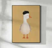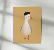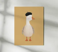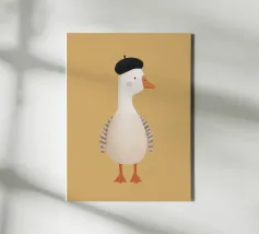 Un'affascinante illustrazione di un'elegante oca bianca che indossa un classico berretto nero, in posa fiera su uno sfondo color senape. Con le sue morbide piume, le guance rosee e il becco arancione leggermente ricurvo, questo elegante personaggio cattura il giocoso stile francese in un design minimalista e moderno.