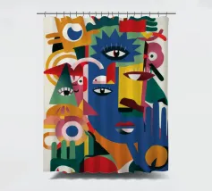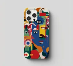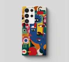Una disposizione caotica di forme e motivi astratti colorati presenta occhi e mani multipli sparsi. I colori vibranti e le forme dinamiche creano un senso di movimento ed energia.