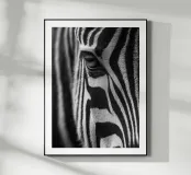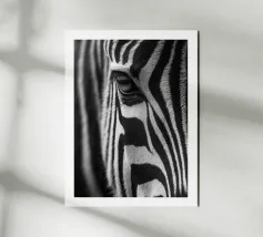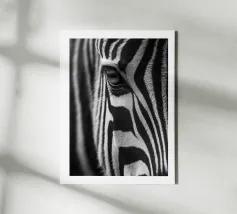 Poster in bianco e nero di una zebra in primissimo piano, che si concentra sull'occhio e sulle sue strisce grafiche. I contrasti profondi, la consistenza del manto e le linee naturali creano un'immagine minimalista e senza tempo. Stampata in alta definizione, rivela la finezza delle ciglia, lo scintillio dell'occhio e il ritmo ipnotico delle strisce. Ideale per un soggiorno, un ufficio o una camera da letto, con un'atmosfera safari chic e un arredamento contemporaneo.