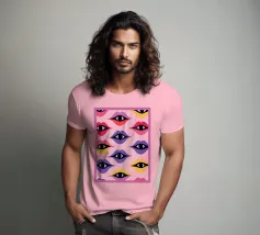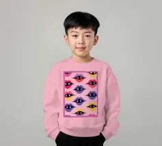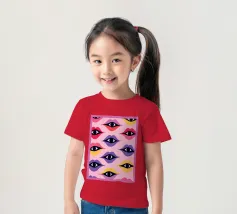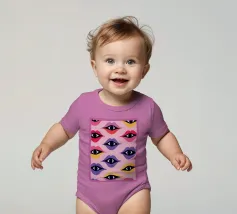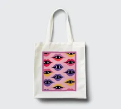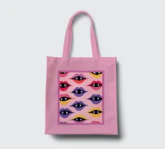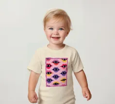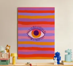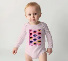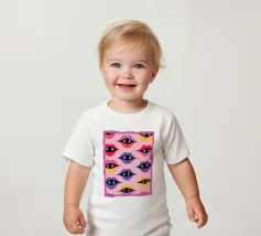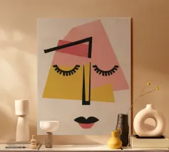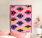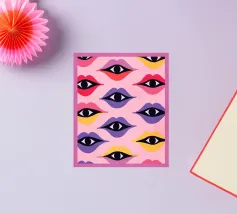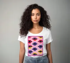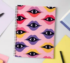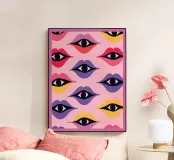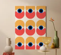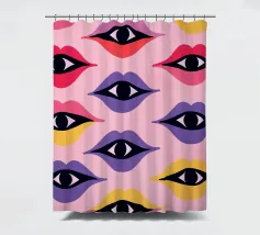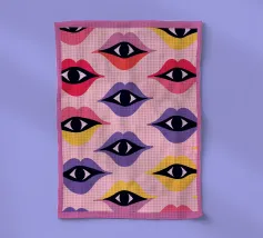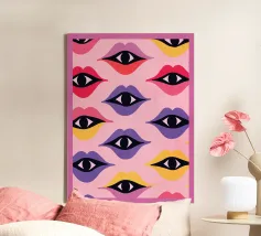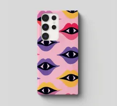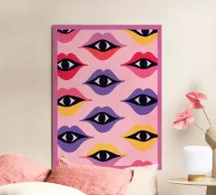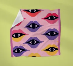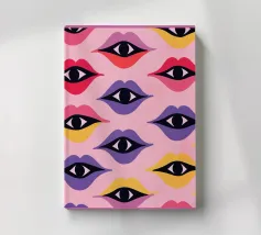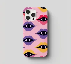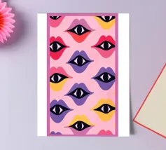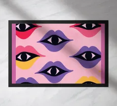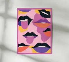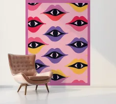 Illustrazione surreale di occhi e labbra con motivi pop art colorati e audaci forme geometriche.