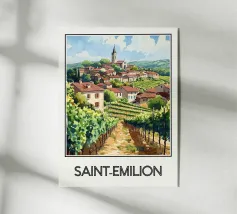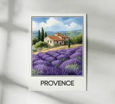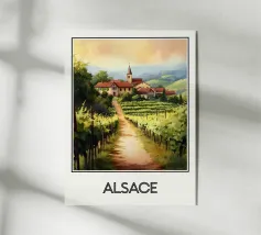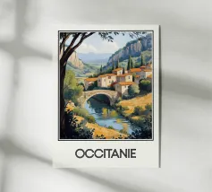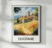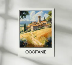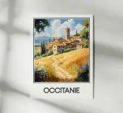 Affiche de décoration représentant un charmant village occitan avec ses maisons en pierre aux toits rouges, entouré de champs dorés et de collines verdoyantes. Une scène paisible et lumineuse qui capture l'essence du Sud de la France, parfaite pour une ambiance chaleureuse et authentique.