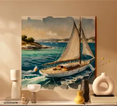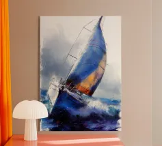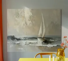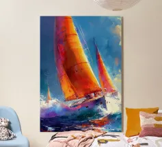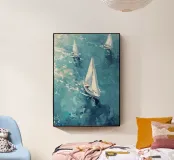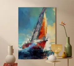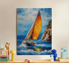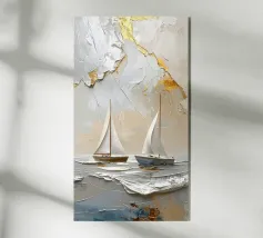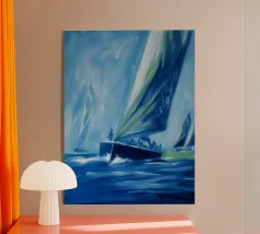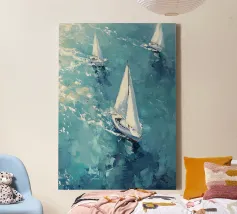 Da un punto di osservazione elevato, una piccola flotta di barche a vela scivola su un mare di azzurri sfumati, con ogni imbarcazione che incide scie spumeggianti nelle acque illuminate dal sole. I tratti decisi dell'impasto catturano l'energia delle vele piene di vento e delle correnti mutevoli. "Ocean Parade" invita a unirsi al viaggio ritmico di esplorazione e libertà, dove ogni onda racconta una storia.