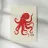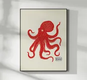 Un'audace illustrazione in bianco e nero di un polpo rosso con tentacoli fluenti, su uno sfondo beige minimalista. La composizione dinamica è accentuata da un timbro rosso con la scritta "Octopus", che aggiunge un raffinato tocco artistico.
