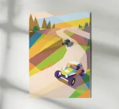 Illustrazione di veicoli fuoristrada su strade di montagna con uno stile geometrico moderno.