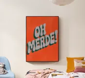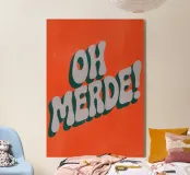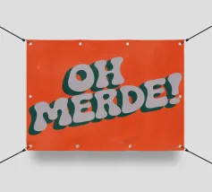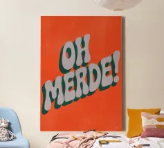 La scritta francese "OH MERDE!" appare in grandi lettere bianche con un bordo blu scuro su uno sfondo arancione. La disposizione diagonale e la texture leggera dello sfondo conferiscono al poster dinamismo ed espressività. Un design tipografico moderno e umoristico.