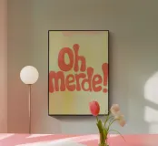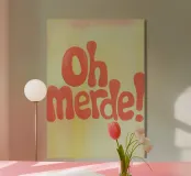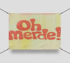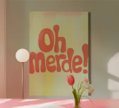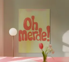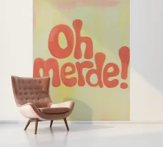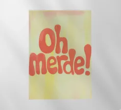 La scritta "Oh Merde!" appare in grandi lettere arancioni su uno sfondo color crema. Linee irregolari disegnate a mano e sottili pennellate nei toni del giallo e del rosa creano profondità e consistenza. Un design tipografico moderno, umoristico e pieno di fascino.