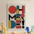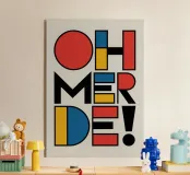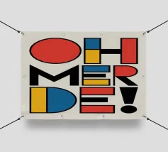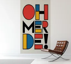 Disegno tipografico con la scritta "OH MERDE" su sfondo beige chiaro. Ogni lettera è composta da forme geometriche in nero, giallo, rosso e blu, disposte in modo leggermente sfalsato. Un design moderno e astratto con una combinazione di colori ritmica e accattivante.