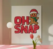 Un allegro personaggio di pan di zenzero che indossa un cappello e una sciarpa da Babbo Natale è affiancato dalla scherzosa frase "OH SNAP" in lettere rosse.