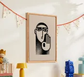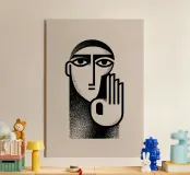 Un ritratto raffinato e minimalista, costruito su geometrie audaci e contrasti contenuti. Il volto semplificato e la mano sollevata formano un gesto iconico e silenzioso che suggerisce una pausa, l'ascolto o la riflessione. Le linee pulite e la texture accuratamente posizionata conferiscono all'immagine una qualità grafica senza tempo, bilanciando la chiarezza con una sottile profondità emotiva.