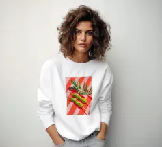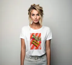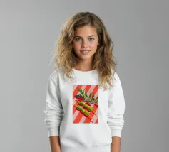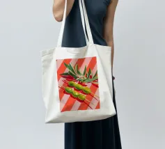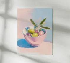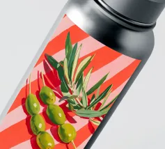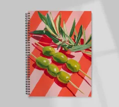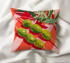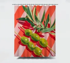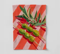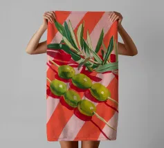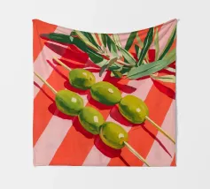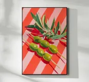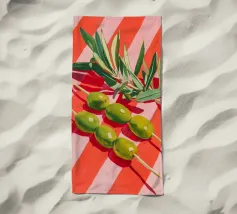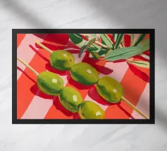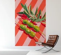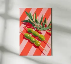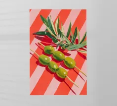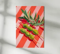Vivace e pittoresca natura morta con olive verdi su uno spiedino, abbinate a foglie fresche su uno sfondo dinamico a strisce di colore arancione caldo. I colori vivaci e lo stile moderno dell'illustrazione conferiscono al motivo un tocco mediterraneo, leggerezza ed energia estiva.