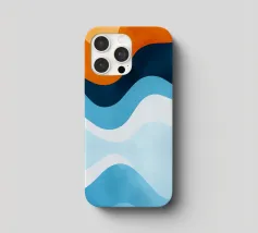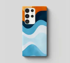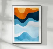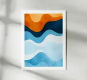 Illustrazione moderna e minimalista di onde ondulate nei toni del blu e dell'arancione. Un disegno astratto e rilassante, perfetto per un arredamento contemporaneo e artistico.